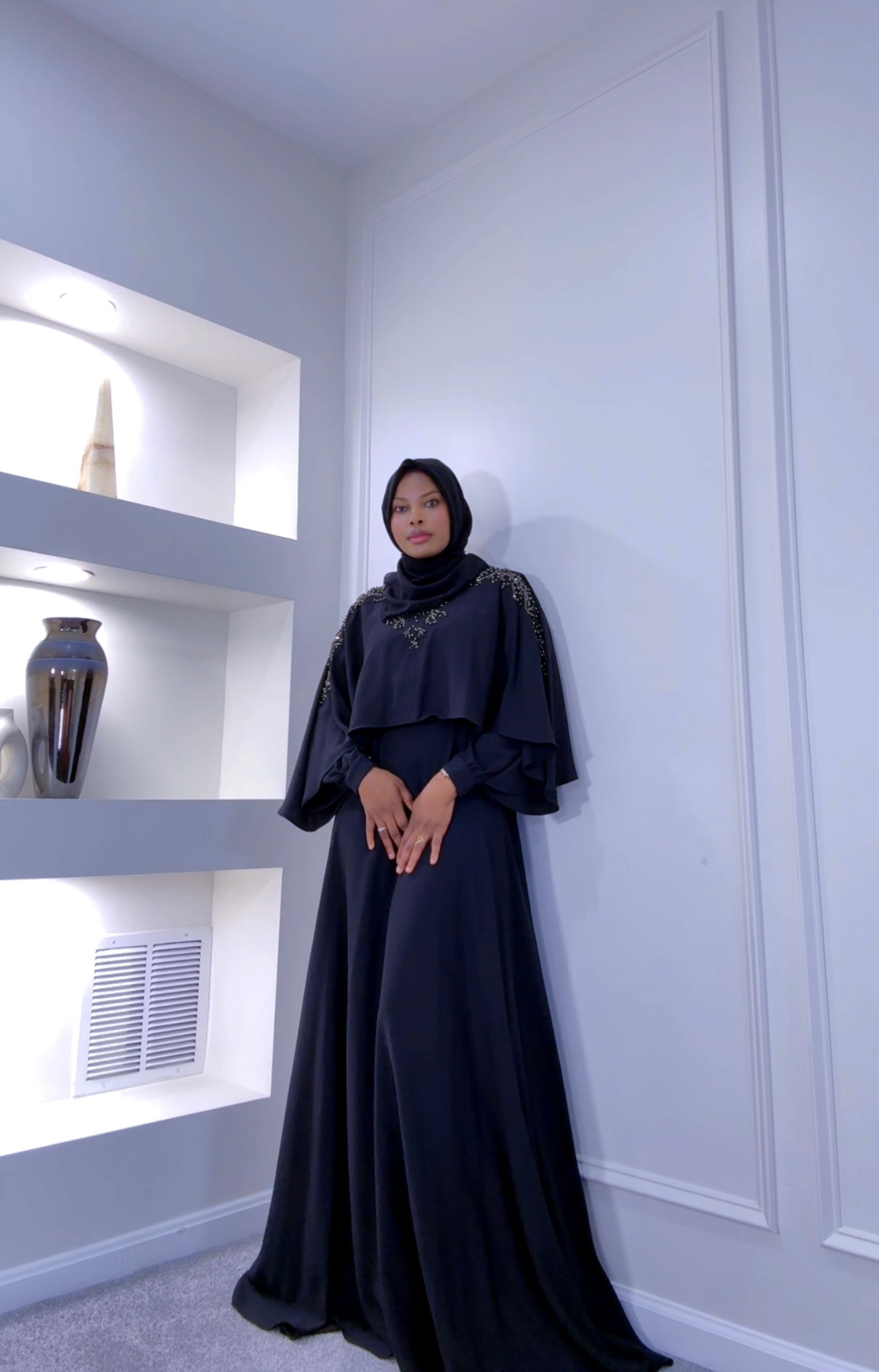The Diadem is a sophisticated black cape dress adorned with elegant beading, adding a touch of luxury to any occasion. Crafted with intricate details and a timeless design, this dress is sure to make a statement and elevate your style. Perfect for formal events, it offers both fashion and function.