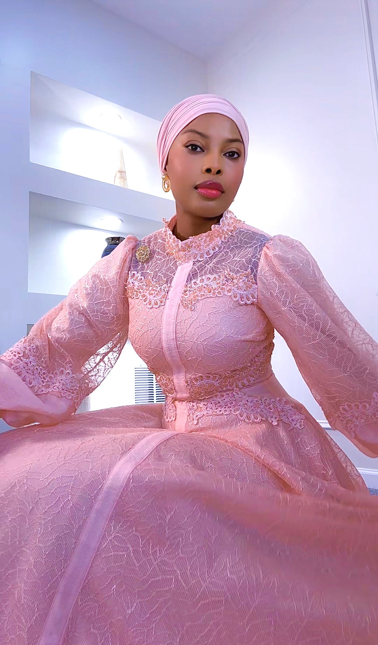 Yasmin! It has a warm, delicate pink tone with slight peach undertones, Designed with delicate lace detailing, full-length sleeves, and a flattering A-line silhouette, this dress effortlessly combines modesty and elegance.